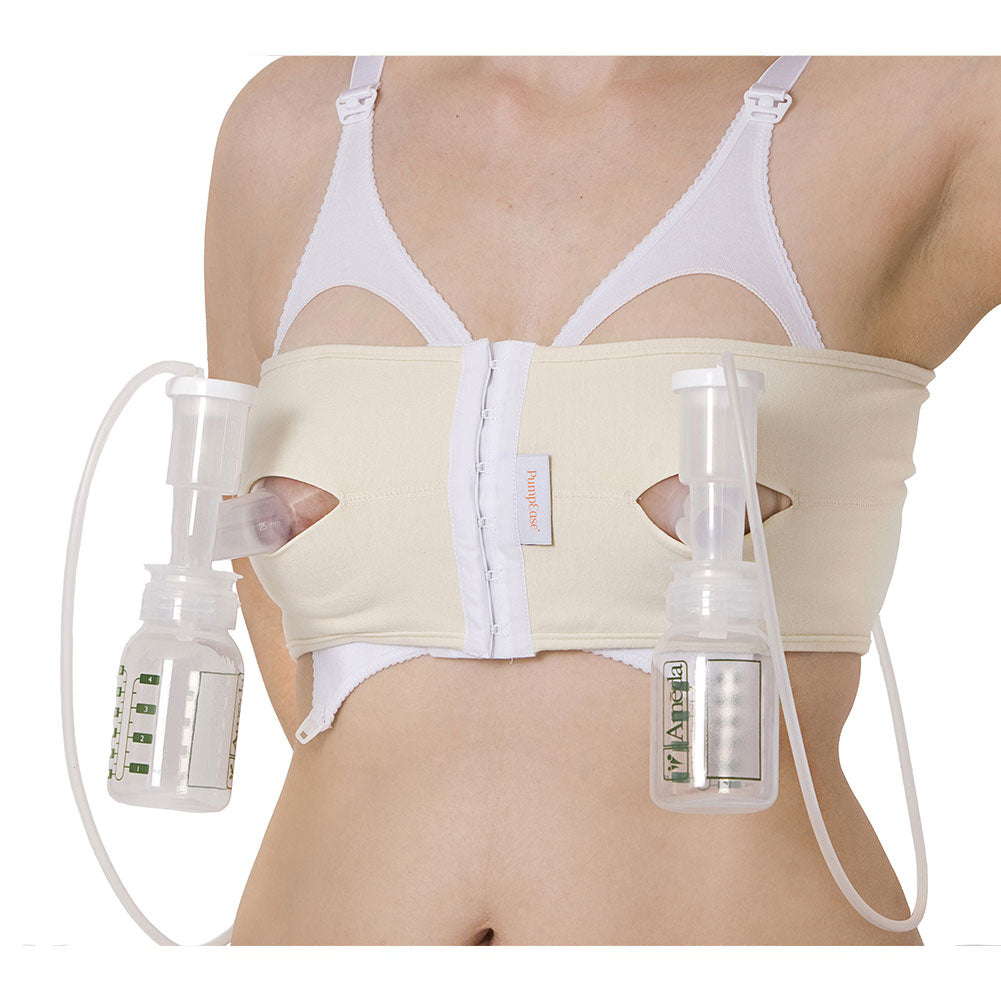 Simply wrap PumpEase around your bust and fasten in the front over your nursing bra, nursing top (lower panels first) or over nothing at all. Insert the breast pump flanges into the openings, centering over your nipples and then start pumping. You will enjoy having both hands free to read, write, text, talk on the phone, surf, bank online or tend to your baby - ALL while pumping!