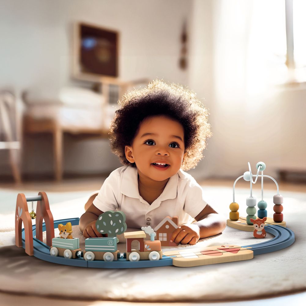 Including 8 pcs colored curved train track by beech FSC Certified Wood from our certified supplier . Perfect for solo play or group fun, the Multi-Activity Railway Set is more than just a toy, it's a journey through creativity, coordination, and discovery.