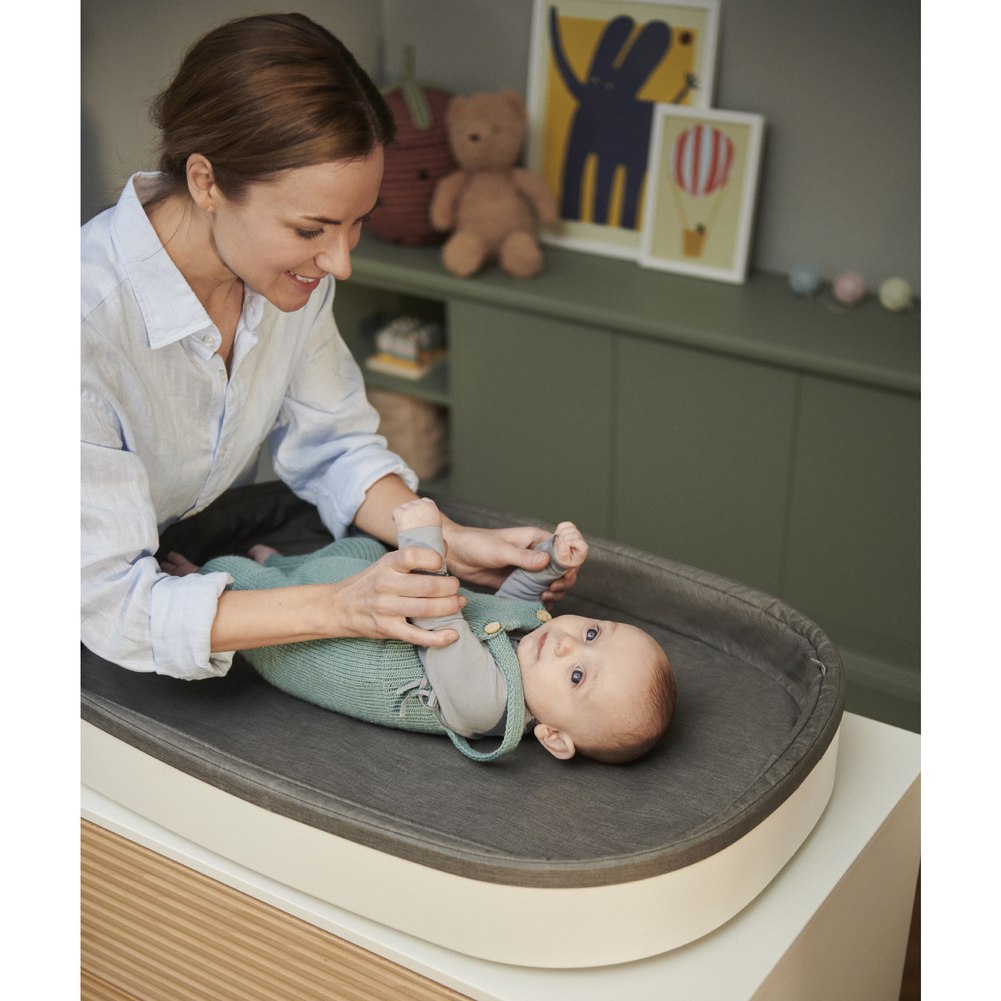 The changer can be safely used on top of the Stokke® Sleepi™ Dresser. Its protective sides and padded mattress offer a safe and comfortable environment for you to change your little one. The height of the Changer encourages eye-contact, and you can choose both sideway or parent facing position depending on the base unit and room. It comes with a water repellent changing pad with protective sides for baby. This changing pad is soft to baby’s skin, removable and machine-washable.