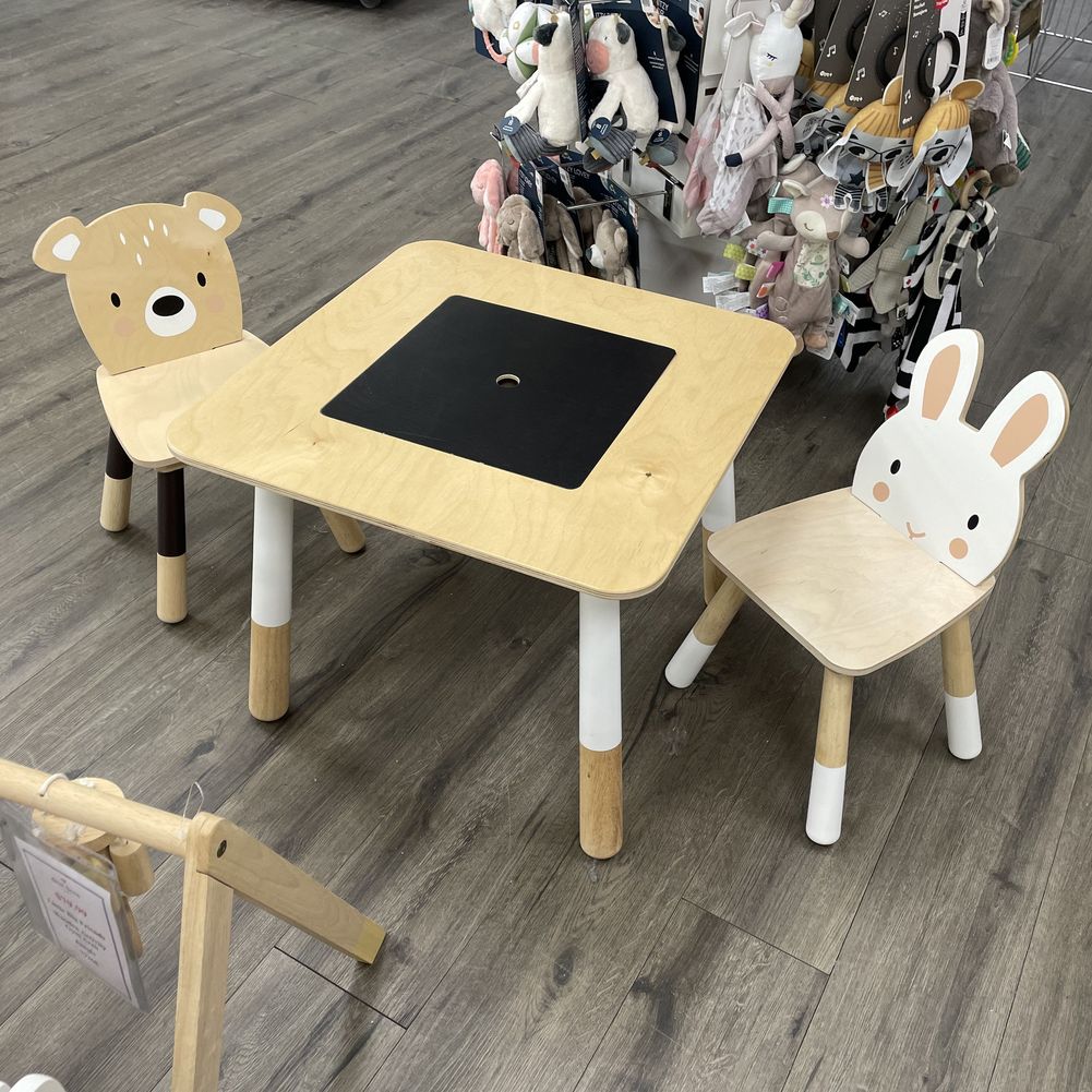 A sturdy plywood and rubberwood childrens table with a removable chalkboard central panel. When the panel is removed it reveals a hidden compartment to store pencils etc. 2 plywood and rubberwood childrens chairs with a bear and bunny faced back panel.