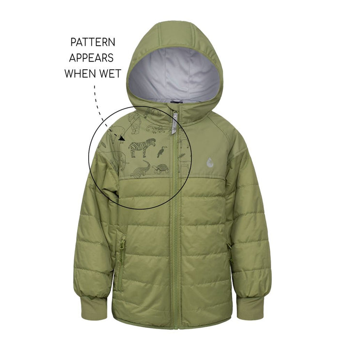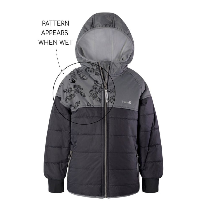 Therm Kids' Hydracloud features a full waterproof (hydra) and windproof outer combined with ultra-soft cloud-like comfort. Providing midweight warmth and protection in wind, rain and snow, and lined with soft-touch jersey mesh for a cozy feel inside. And when the puffer gets wet, a secret pattern is revealed! See the SplashMagic pattern appear in the rain then disappear again when dry. Fun for toddler and big kids alike!